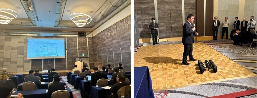 北陸未来共創フォーラム次世代農林水産分科会農業・林業のスマート化WGでは、人手不足や高齢化などをはじめとする農業・林業の社会課題解決に貢献する研究シーズなどを紹介するイベントを2025年3月17日に金沢市内のホテルで開催しました。今回は、スマート農業の現状と国の技術導入支援策等についての発表や、ソフトロボットによる果実の収穫やAIを活用した圃場観察など、最先端技術の活用事例を紹介しました。はじめに、北陸農政局生産部の岡本博環境・技術課長から「スマート農業の現状と、技術導入支援策等について」、北陸先端科学技術大学院大学のHo Anh Van教授と博士後期課程の只野利恩氏から「やさしく、効率的に果実を収穫・搬送するソフトロボット技術の紹介」、金沢大学産学融合研究会の北條琉人と 東京農工大生物システム応用科学府博士後期課程の寺田憲司氏から「圃場観察ロボットとAIによる営農支援研究」について発表を行いました。その後、実際のソフトハンドロボット、圃場観察ロボットを約30名の参加者の皆様と見学して、議論をしました。